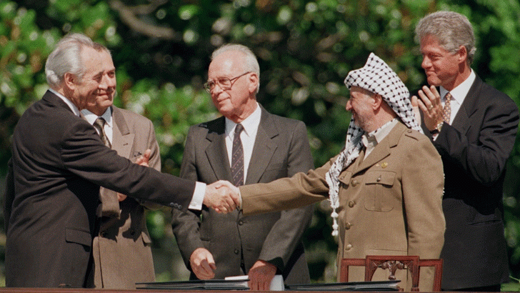 Né meglio andarono le elezioni del 1981 (di nuovo perse) o quelle del 1984, dove a fronte di una maggioranza relativa Peres e alleati non riuscirono a formare un Governo stabile e dovettero accontentarsi di una coabitazione coi rivali del Likud, guidati da Shamir, successore di Begin, durante la quale esplose nei Territori Palestinesi la Prima Intifada. Dopo un fallito tentativo di escludere i Likudniks dal Governo con una improbabile coalizione tra laburisti, ultrasinistra e partiti religiosi (il cosiddetto “Sporco Trucco” dell’aprile 1990), Peres si trovò a guidare l’opposizione laburista in Parlamento durante i primissimi anni ’90, finché non dovette cedere a Yitzakh Rabin la guida del partito. Rabin ricompensò il rivale interno con l’importante poltrona di Ministro degli Esteri e in questa veste Peres, coinvolto in guerre e piani bellici contro tutti gli stati vicini fin dal 1948 si trovò sorprendentemente insignito del Premio Nobel per la Pace a seguito degli Accordi di Madrid e poi di Oslo per la cosiddetta “Soluzione a Due Stati”. L’eliminazione violenta di Rabin da parte di un fanatico di Destra lo riportò subito dopo alla guida del Partito Laburista.